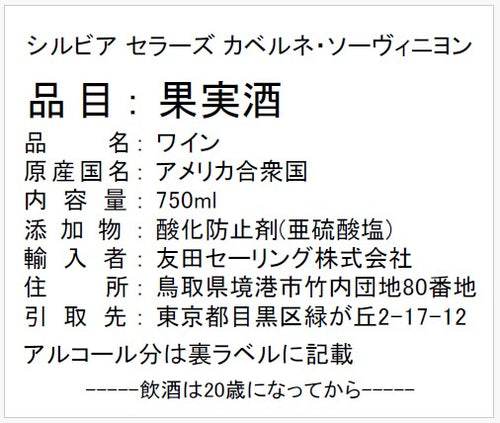 【カリフォルニアワイン】シルヴィア セラーズ カベルネ・ソーヴィニヨン 750ml