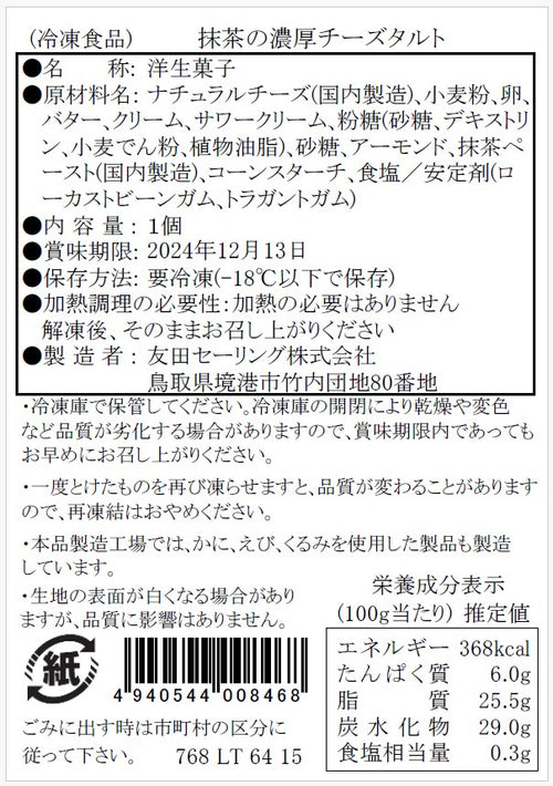 抹茶を贅沢に使用し、濃厚なチーズタルトに仕上げました。