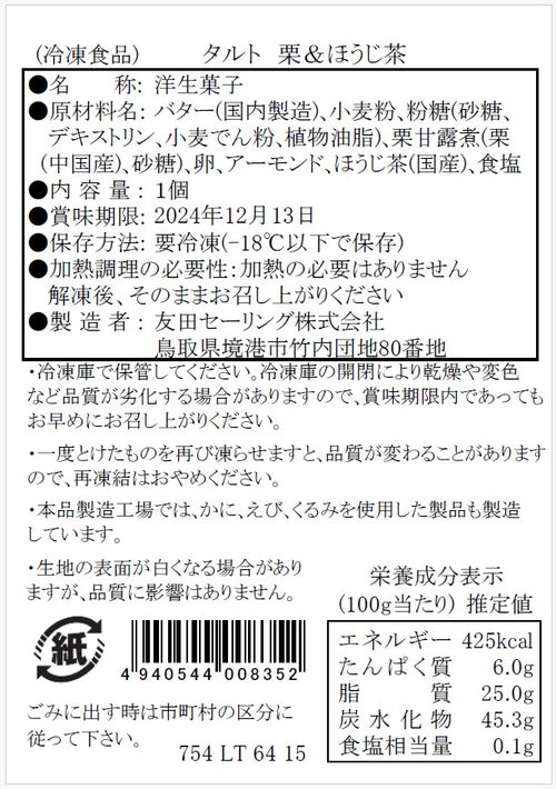 【タルティア】冷凍タルト 栗&ほうじ茶 ホールサイズ