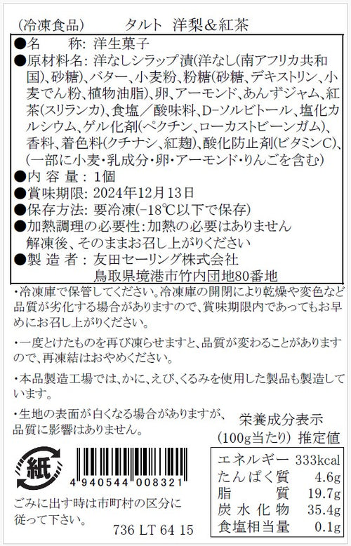【タルティア】冷凍タルト 洋梨&紅茶 ホールサイズ